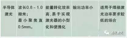 二、半導(dǎo)體激光焊接的光源在激光焊接工藝中,隨著半導(dǎo)體材料工業(yè)的快速發(fā)展,半導(dǎo)體激光作為光源也漸漸得到了應(yīng)用。焊接的特點如表1所示: