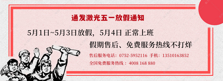 假期預(yù)告:通發(fā)激光自2022年5月1日起至5月3日放假三天,期間售后服務(wù)、全國免費(fèi)服務(wù)熱線暢通,持續(xù)為大家提供有力的設(shè)備使用保障!
