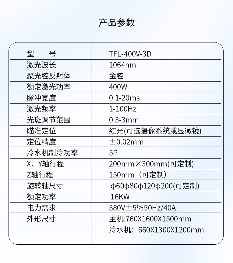 1、TFL-400V/500V-3D,由雙路氙燈泵浦、進(jìn)口陶瓷反射腔體及Nd:YAG晶體棒構(gòu)成激光器,電光轉(zhuǎn)換效率高。