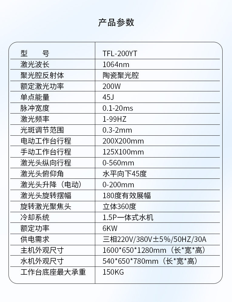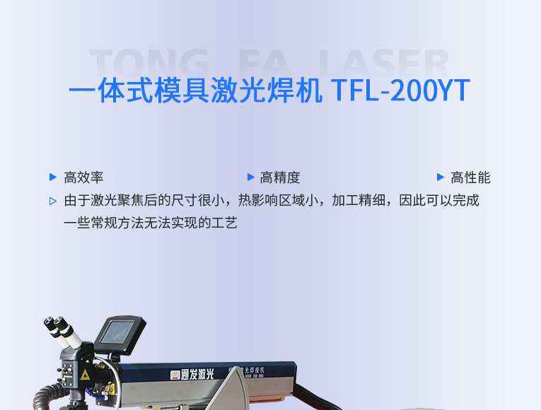通發(fā)激光一體式模具激光焊機(jī)TFL-200YT/TFL-400YT是一款多種功能融合一體的新型模具激光焊接機(jī),針對特大型塑料模具激光焊、中型注塑模具激光燒焊、小型塑膠模具激光補(bǔ)焊、壓鑄模激光補(bǔ)焊具等各類模具可實(shí)現(xiàn)超精密修復(fù),幫您解決大型汽車模具修復(fù)難題,不需要模具移動,電動工作臺與立體旋轉(zhuǎn)激光頭完美結(jié)合,操作桿控制運(yùn)動移動實(shí)現(xiàn)輕松激光修復(fù)大型模具,同時也保留了傳統(tǒng)手動工作臺超精密修復(fù)模具功能。