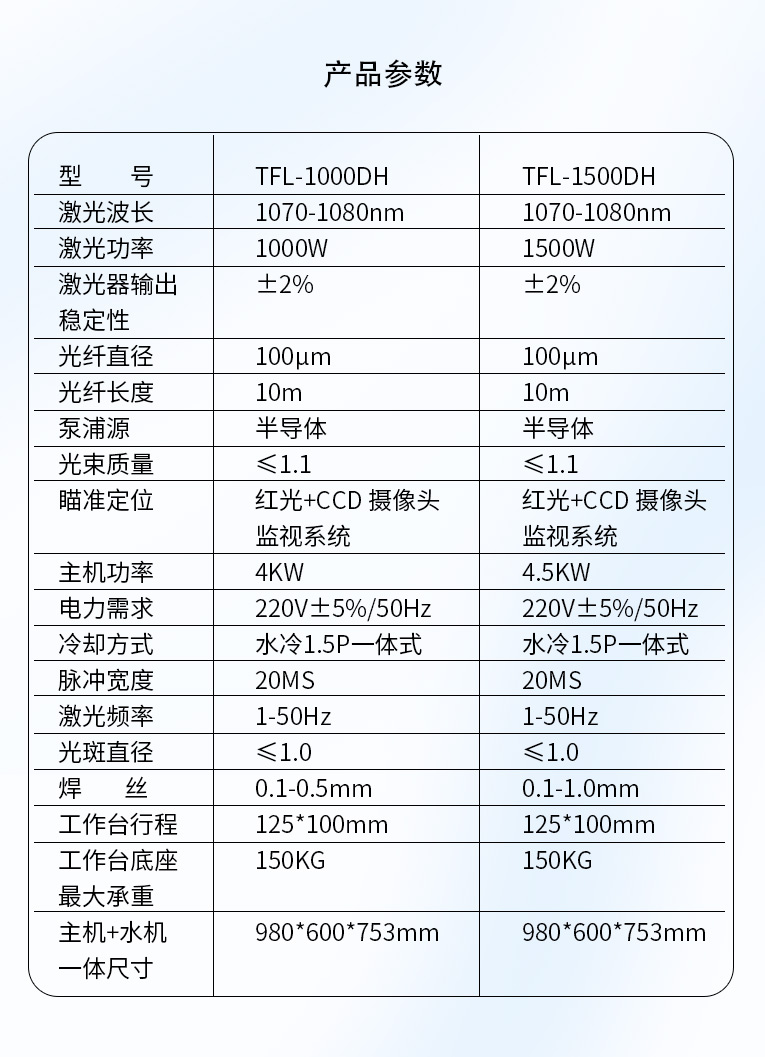 采用光纖激光器,反射率高,能量強,免維護,免調光,功耗少,相比傳統(tǒng) 模具焊來說,體積小,安全,穩(wěn)定性好超長使用壽命。 1000W光纖激光器,滿足銅、鋁焊接量大的模具及產品焊接加工需要。 高承重底座及工作臺,保持輕便靈活的優(yōu)點,同時提供更高承載能力。 配備.1.5P大功率一體式水冷水機,保證了大功率焊接的穩(wěn)定性。